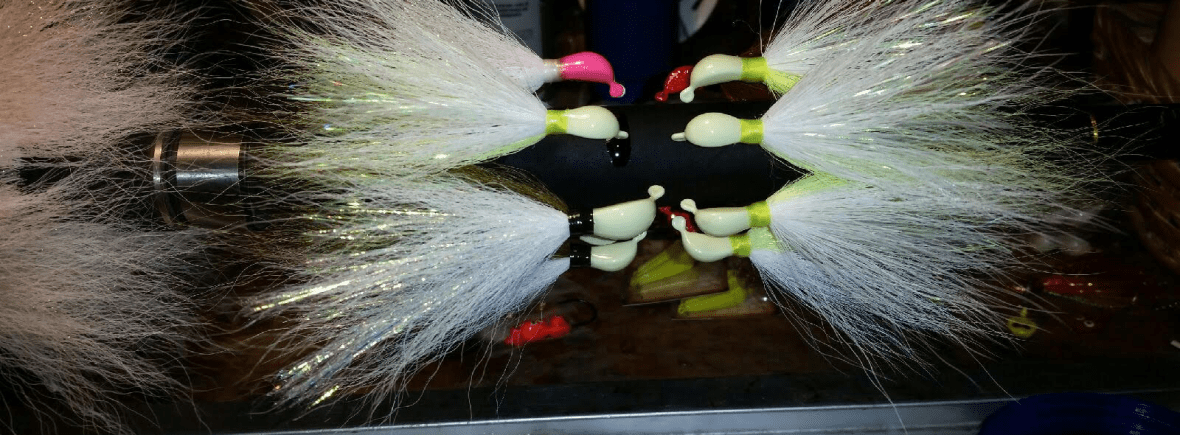 The olive-back-white belly jig is one of our most popular. It is a versatile buck tail jig.